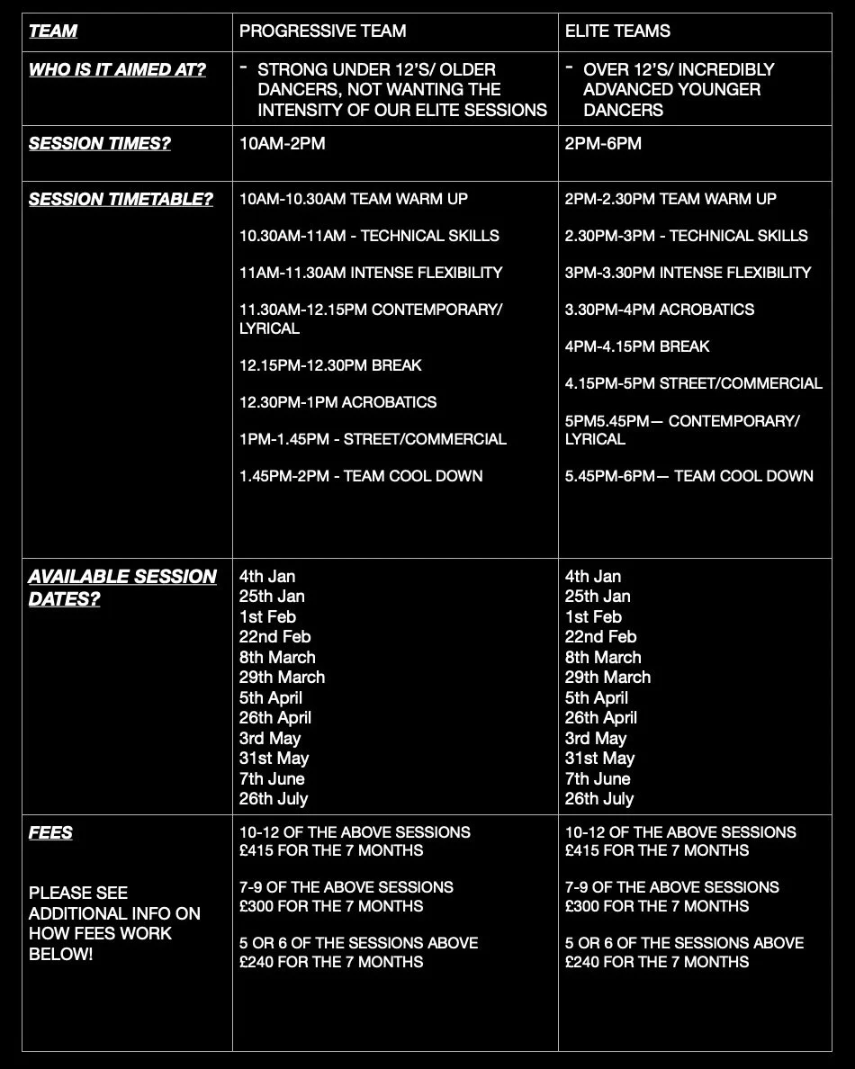 4 hours of high intensity, quality classes per session, a wide range of styles to help with dancers versatility!